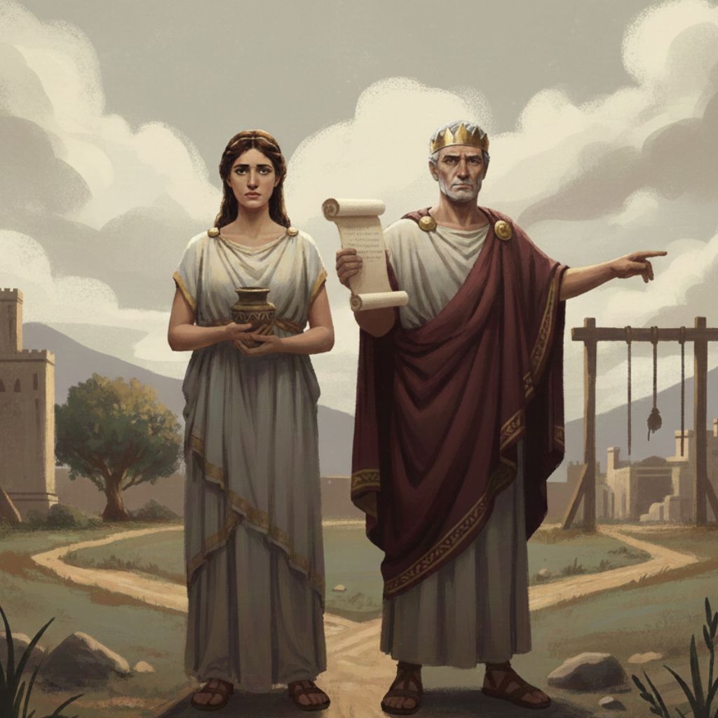 W tragedii Sofoklesa obserwujemy starcie Antygony z Kreonem, władcą Teb. Główna bohaterka, działając w zgodzie z prawem boskim dotyczącym pochówku zmarłych, postanawia pogrzebać brata, Polinika, wbrew surowemu zakazowi króla. W jej przekonaniu prawo boskie, nakazujące otoczenie zmarłego czcią, pozostaje nienaruszalne i absolutne, nawet jeśli akt buntu wobec władcy wiąże się z wyrokiem śmierci.