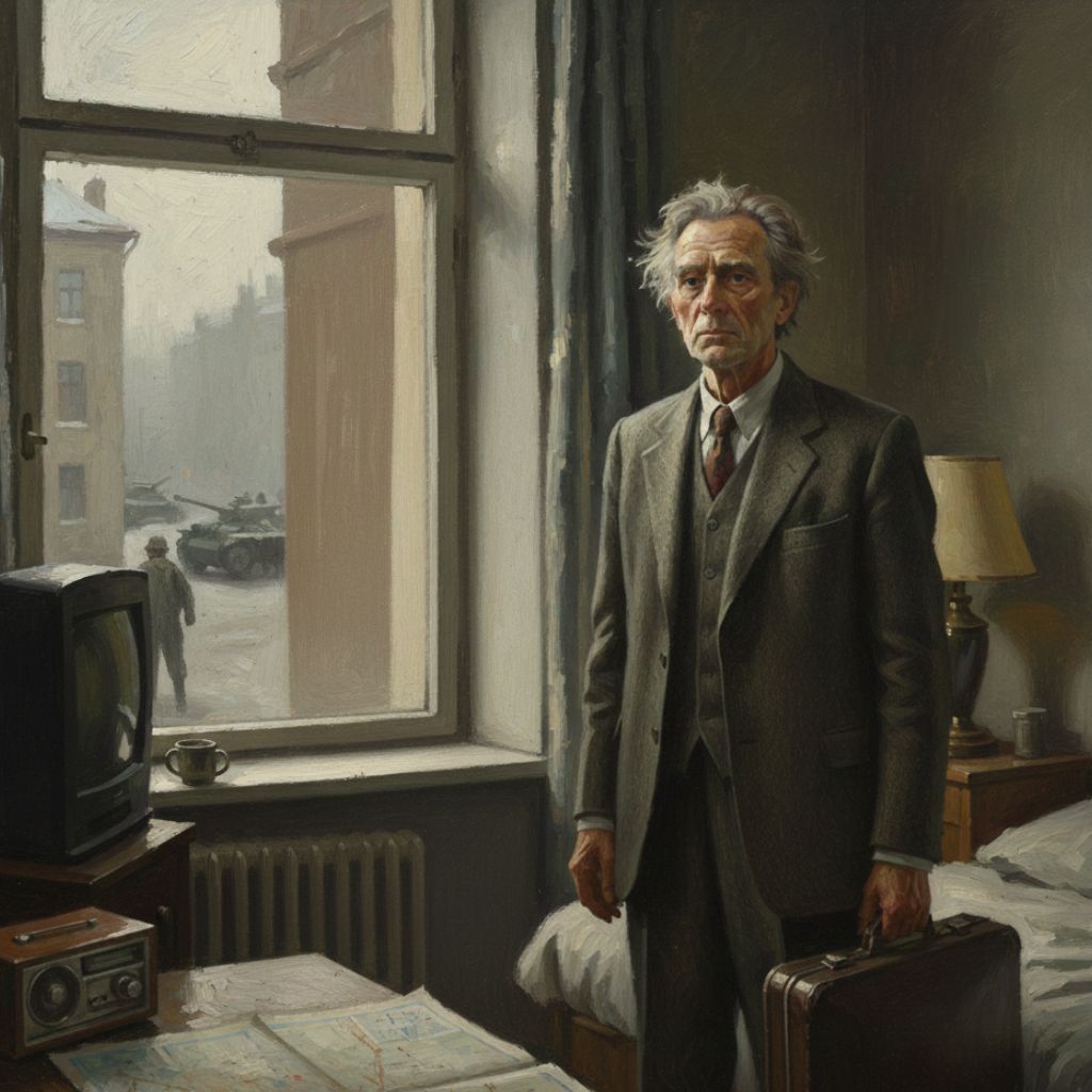 Jednak już pierwszej nocy zaczynają dziać się rzeczy niezrozumiałe dla profesora. Przydzielona mu opiekunka nagle przestaje odbierać telefony. Nie udaje mu się także nawiązać kontaktu ze znajomymi z Anglii. Naukowiec zostaje sam w wynajętej kawalerce. Obserwuje na ulicach czołgi, ZOMO i wozy opancerzone.